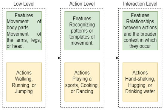 Typically, any actions performed by a human possess an intrinsic vertical structure consisting of multiple levels and are thus divided into three levels; low-level, action-level, and interactions-level as shown in Figure 1. The low level is also known as the atomic level i.e., hands waving, head shaking and facial expression. A composition of these atomic levels forms highly complex actions. The second level deals with the activities (actions) performed by a human i.e., walking, running and jogging. The third level deals with the actions that interact with other human(s) or object(s) [3] i.e., hand-shaking, hugging each other and drinking water.