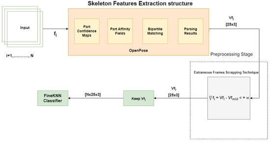 This section presents the proposed methodology for HAR in complex video sequences. The proposed design involves reading frames, extracting skeleton features, preprocessing and training the FineKNN classifier. The workflow of the proposed system is depicted in Figure 3. Initially, the video is loaded into the system. The system then read each frame while extracting the skeleton feature simultaneously. Next, the proposed Extraneous Frame Scrapping (EFS) Technique was applied to the extracted skeleton features. Finally, the output from EFS is fed into the FineKNN classifier for the classification process. The details of each step are provided below.
