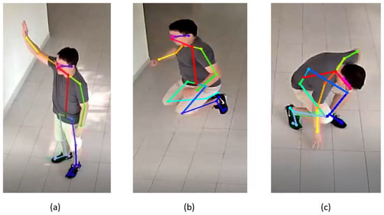 For the skeleton extraction part, we used the existing OpenPose algorithm [19] since it has reliable performance in producing the skeleton features from the conventional 2D RGB images. Thus, there is no requirement to replace the existing systems with 3D imaging or depth sensor devices. The OpenPose algorithm is capable of detecting the 2D poses of several people in a given image. Realtime multi-person 2D pose estimation is a key component in enabling machines to have an understanding of people in images and videos. It uses a bottom-up approach to detect these 2D poses by capturing and locating body parts associated with people in the image. By default, OpenPose returns the position of the 25 joints (customizable) of each detected body as a vector of pairwise coordinates (x, y), along with the confidence score C, for each detected joint. The skeleton detection of several parts is shown in Figure 4.
