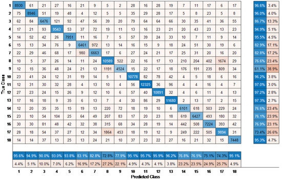 Next, to demonstrate the efficacy of the proposed method with respect to each individual class, we implemented Fine KNN with and without the EFS technique. This experimentation was used to compare with our previous work, whereby no preprocessing stage was considered [22]. The confusion matrix for the MCAD dataset without the EFS technique is shown in Figure 6. The overall performance accuracy obtained was 86.99%. The last two columns show the average accuracy and average error per individual true class. Since no preprocessing stage was initiated, all frames, including the irrelevant frames were used. By accumulating only the useful frames (i.e., those that have lower than difference from the reference mid frame ), the performance accuracy increases by 3% to 89.75%. The proposed methods accuracy improves due to the proposed EFS technique, which eliminates the frames from the training data that does not belong to a particular action.