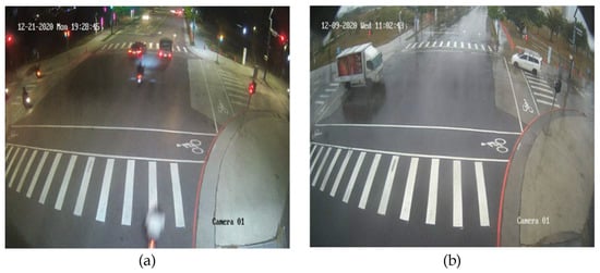 Vision sensors are the most common sensors around us and their applications are everywhere. They have many advantages, such as high resolution, high frame rate, and low hardware cost. As deep learning (DL) has become extremely popular [,], the importance of vision sensors has gradually peaked. Since the visual sensors can preserve the appearance information of the targets, they are best suited for DL technology. As aforementioned, it can be noted that camera-only object detection is widely utilized in a lot of fields for numerous applications, such as smart roadside units (RSU), self-driving vehicles, smart surveillance, etc. However, the results of object detection by the camera are severely affected by the ambient light and adverse weather conditions. Although the camera can distinguish the type of objects well, it cannot accurately obtain the physical characteristics such as the actual distance and velocity of the detected objects. In the ADAS industry, many companies with relevant research such as Tesla, Google, and Mobileye, use other sensors to design their self-driving cars to make up for the lack of camera failures in bad weather and lighting conditions such as nightlight, foggy, dusky, and rainy conditions as shown in Figure 2.
