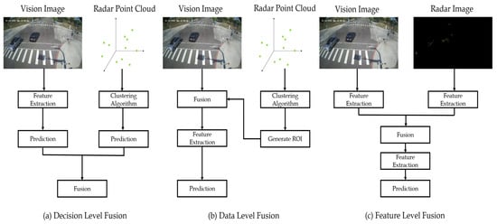 As discussed in the previous section, the methods of sensor fusion [,] are broadly categorized into three types viz, (a) decision-level fusion, (b) data-level fusion, and (c) feature-level fusion as shown in the respective flowcharts in Figure 3.
