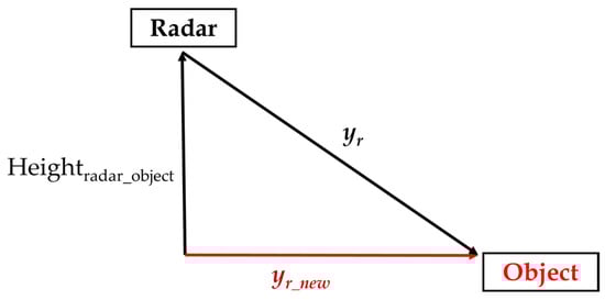 First, we must transform the radar coordinate Or-xryr to radar world coordinate Orw-xrwyrwzrw. Since the radar only has 2-D coordinates and no z-axis information, we can only get the relevant 2-D distance (x, y) between the radar and the object. Therefore, to get the radar world coordinates, we need to calculate the radar yaw angle and the height difference between the radar and the object. In the case of the height difference, since the radar does not have z-axis information, we need to consider the height difference between the radar and the object to calculate the projected depth distance “yr_new” correctly. In Figure 10, we show the height relationship of mmWave radar and the object. The parameter “yr” is the depth distance from mmWave radar and the “Heightradar_object” is the height difference between the mmWave radar and the object. The function shows how we obtain the projected depth distance “yr_new” using Equation (1).