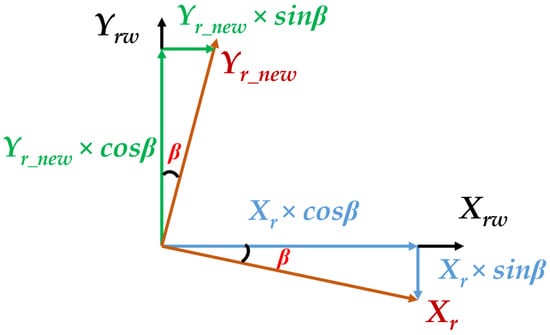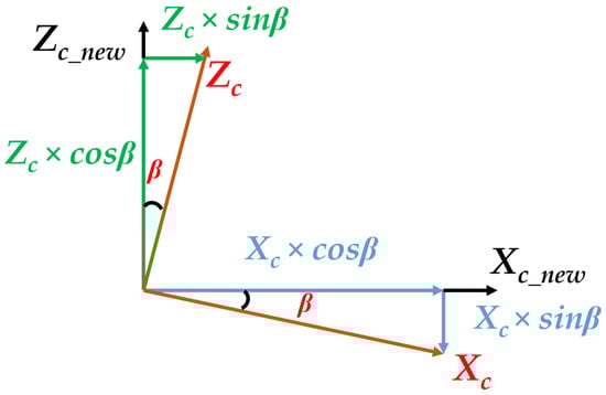 Then, similar to the above conversion of radar coordinate to radar world coordinate, we also regard the yaw angle “β” effect of the camera coordinate. Figure 12 shows the relationship between the camera coordinate, the new camera coordinate, and the yaw angle. Thus, the function shows the equation to transfer the original camera coordinate to the new camera coordinate influenced by “β” as in Equation (5).