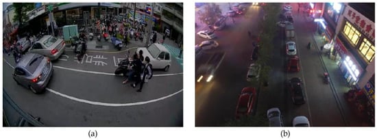 To solve this problem, we used camera-only datasets, such as the COCO dataset [] and the VisDrone dataset [] to increase the amount of training data. The Chinese characters in Figure 16a is the traffic rule craved on the road and in Figure 16b is the name of a business unit. Since these open datasets are only camera data, we set all pixel values in the radar channels to zero. Figure 16 shows examples of the datasets. Considering our applications also require RSU perspectives, we used VisDrone and the blind-spot datasets to fit our real-life traffic scenario requirements.