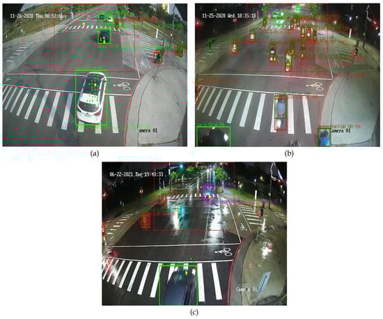 The demo of the proposed system: (a) morning, (b) night, and (c) rainy night.
