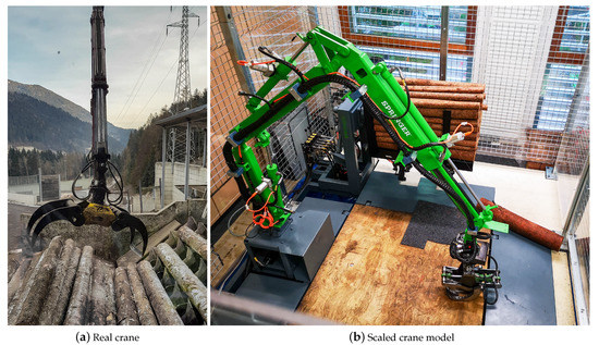 The system targeted in this work is a 5-Degrees-of-Freedom (DoF) hydraulically actuated crane, shown in Figure 1. It is intended to manipulate logs in forestry sawmills, e.g., in automatic placement of unordered (dumped) logs on conveyor belts for further processing. The investigations leading to our results have been performed on a 1:5 scaled version of the real crane [38], displayed in Figure 1b. The crane model is equipped with Inertial Measurement Units (IMUs), draw wire sensors, monochrome cameras, hydraulic pressure sensors and angular position sensors [39]. In addition, the workspace of the crane model is captured by depth and OptiTrack cameras installed inside the protecting cage. Nevertheless, none of those sensors is suited for being installed into the gripper, either due to an inadequate sensing principle or the inability to withstand strong impacts.