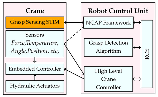 High level data acquisition and processing framework. The crane consists of various sensors for monitoring and hydraulic system for actuating the position control. It also has an embedded controller for controlling the crane based on external from the high level controller. The designed grasp sensing system (STIM) is mounted on the crane in a protective cavity. The STIM communicates to the Network Capable Application Processor (NCAP) framework in the host computer via BLE; the obtained data is then used for further processing and passed to a program using Robot Operating System (ROS).