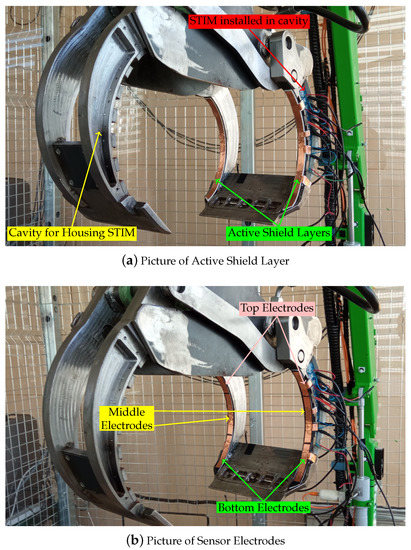 Experimental setup. (a) The placement of active shield layer on the gripper’s claw is shown. One of the cavities for holding the STIM is shown clearly on the gripper’s inner claw. The STIM is placed in a cavity on the right finger of the outer gripper. (b) The construction of the sensor electrodes.