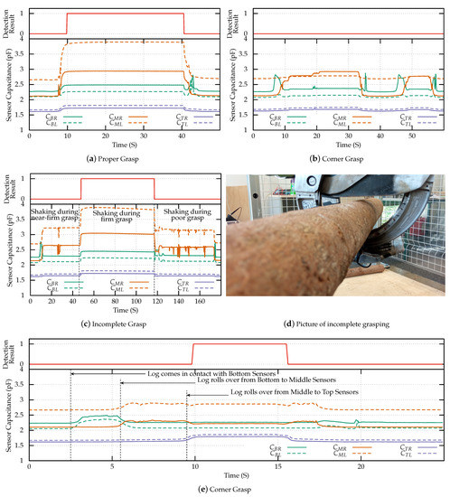 The ability of the sensor to detect grasp firmness (for big logs) during crane movement was tested next. Initially an incomplete grasp was performed on the log and the crane was moved (including fast jerky motions) over the work space. The results are show in Figure 8e. Initially (t < 150 ), we can see that the sensors’ capacitances are not stable during the crane movement and often experience large change in value. At t = 150 , firm grasp is performed and the crane is moved again. Here we can see that the sensor capacitance remains stable, indicating firm proper grasp.