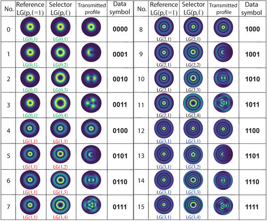 For future research, it is relevant to mention that the number of circular fringes in the intensity profile of an LG mode are directly related to the index p, while the spatial distribution of these fringes is related to the index ℓ; therefore, the number of bits can be extended to more than 4-bits for the case where . This fact opens new opportunities for the development of advanced encoding systems.