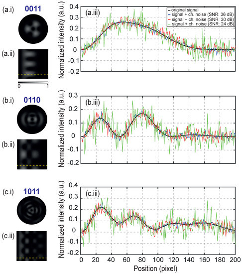 To understand how the combination of these noises affects the transmitted signal, three different data symbols are presented in Figure 3: 0011 (Figure 3a.i), 0110 (Figure 3b.i) and 1011 (Figure 3c.i) with their corresponding 2D linear transformations of 200 × 200 pixels (computational burden), Figure 3a.ii,b.ii,c.ii. With a view to show the impact of the noises in the transmitted signal, the horizontal position arrangement for pixel 50 of the vertical position (x,50) has been chosen for display purposes, which is presented as a yellow dotted line in Figure 3a.ii,b.ii,c.ii. As a result, the normalized intensity curve for such an array is presented in Figure 3a.iii,b.iii,c.iii.