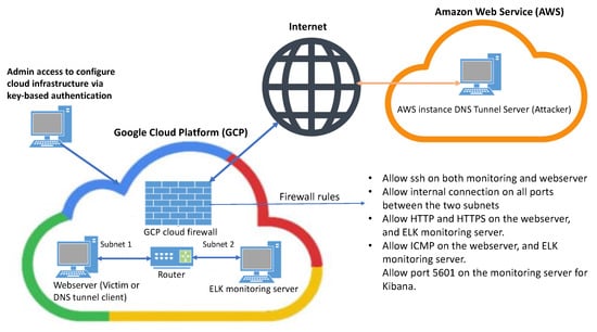 To perform DNS tunnelling, two cloud providers were selected as shown in Figure 1. The DNS tunnel server (attacker) was based on the Amazon Web Service (AWS) cloud and a Webserver (victim) was hosted in the Google Cloud platform (GCP). A monitoring server based on the Elastic stack was also hosted in the GCP. It is important to note that a separate virtual private cloud (VPC) in GCP hosts the monitoring server and the client’s webserver, where both servers were implemented on two different subnets as shown in Figure 1. Each VPC has a firewall, and firewall rules are applied to all the VM instances hosted within the VPC. The VPC network runs a local metadata server https://cloud.google.com/vpc/docs/firewalls#gcp-metadata-server (accessed on 5 December 2022) alongside each VM instance. The metadata server provides basic services such as DHCP and DNS name resolution. The metadata server resolves both internal and external DNS queries, regardless of any firewall rules, using Google’s public DNS servers.