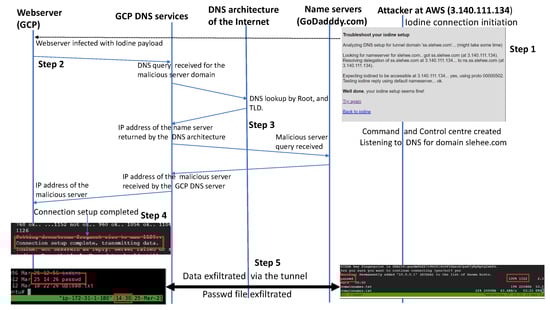The query was received by the DNS server in GCP, which consulted the DNS architecture of the Internet (root and TLD servers as shown in Figure 2) to resolve the IP address of the attacker’s domain (Step 3 in Figure 3). The GCP DNS service resolved the query of the webserver by returning the IP address of the attacker’s server (Step 4 in Figure 3). After the DNS query was resolved, the attacker’s server was able to establish an SSH connection through the DNS tunnel and start the exfiltration process. According to Figure 3 (Step 5), the content of the /etc/passwd file, along with other files, were sent from the client machine (webserver in the GCP instance) to the AWS instance. Highlighted in red, it can be observed that the passwd file from the client was successfully sent over to the server at 14:26 pm.