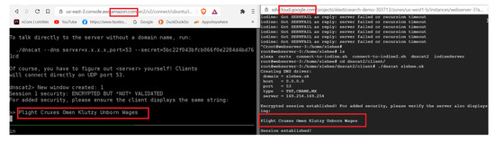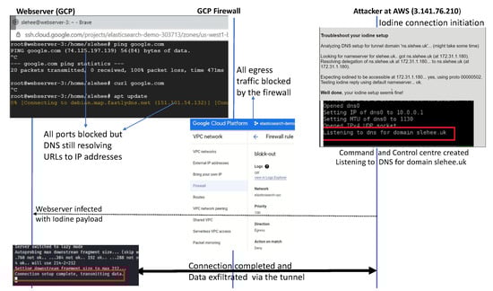In experiment 2, a DNS tunnelling attack was conducted under the constraint of the cloud firewall blocking all the traffic from the webserver to the Internet (egress traffic). The implementation of this experiment was similar to Experiment 1 apart from the firewall constraint. Figure 4 shows the public and the private IP addresses of the AWS instance (attacker’s server). The two nameservers, ns1.slehee.uk and ns2.slehee.uk, pointed to the tunnelling server instance in AWS. The Iodine service started at 3.141.76.210 on the AWS instance (slehee.uk) as shown in Figure 5. It is important to note that URL to DNS resolving is active at the webserver in the GCP, even though the firewall configuration is blocking all egress traffic from the webserver, as shown in Figure 5. The process of tunnelling is initiated once the webserver gets infected with the Iodine payload. All the steps of tunnel initiation (DNS look up by the DNS, root and TLD servers) are the same as in Figure 3. Figure 5 highlights the process of successful data exfiltration via DNS tunnelling under the limitation of the firewall blocking all the outbound traffic of the client machine hosted in the GCP.