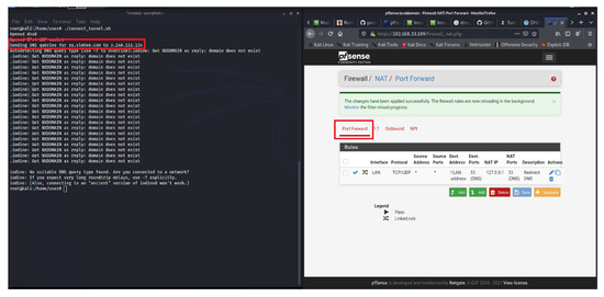 In contrast to this experiment, if the webserver is hosted locally, not in a cloud environment, then the firewall restriction of blocking all the egress traffic would have been sufficient to block the DNS tunnelling attack. To demonstrate this key concept and highlight the difference between the two environments (cloud vs locally hosted), a webserver with a pfSense virtual firewall was locally deployed and all the egress traffic was blocked. The pfSense is also configured as a DNS resolver. The configured firewall blocks DNS requests from local clients to servers outside the local network. In other words, clients are forced to send DNS requests to the DNS resolver on pfSense. This is achieved by creating two rules https://docs.netgate.com/pfsense/en/latest/recipes/dns-block-external.html (accessed on 15 January 2023). The first rule allows DNS queries to the pfSense firewall (pass rule: pass DNS to the firewall), whereas the second rule blocks DNS (Deny rule: block DNS to everything else). Therefore, access to other DNS servers on port 53 will not be possible. This is shown in Figure 6, where the Iodine connection attempt for DNS tunnel initiation was unsuccessful mainly because port 53 was blocked by the firewall. However, as shown in Figure 5, the DNS tunnelling is successful in the cloud environment as Google cloud runs a local metadata server alongside the webserver instance, which provides basic services such as DNS, DHCP and network time protocol. This server is fundamental to the webserver’s functionality; hence it is not possible to block the DNS resolution path through the firewall configuration. This can be addressed by implementing an alternative DNS name server (or host-based firewall) combine with the creation of an exclusion and inclusion list of domains. However, until the domain or the corresponding IP address is blacklisted [26], the DNS connection will be successful in the cloud environment.