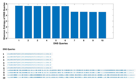 The first part of the figure shows Shannon entropy score of DNS queries. The second part of the figure lists the DNS queries.
