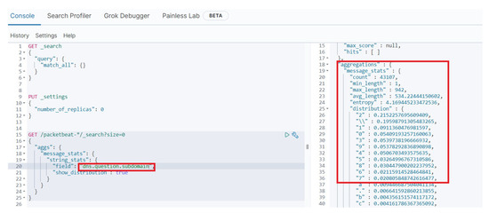 Analysis of the dns.question.subdomain field reveals that some subdomains have a lot of numerical characters in the DNS queries. To get a more accurate view of the character distribution, the Elastic developer tools were used to analyse the dns.question.subdomain field with the Shannon entropy value based on the frequency probability of each character as shown in Figure 9. This figure also shows the distribution of the characters probability in descending order, where numerical characters are residing at top of the list. According to the figure, a higher entropy value coupled with a higher integer frequency probability is a strong indicator of data exfiltration by exploiting the DNS protocol.