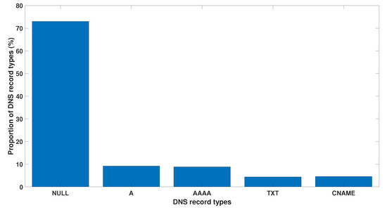 Another feature of the DNS protocol is the resource record type, which presents the type of correspondence, e.g., type A for IPV4, type AAAA for IPV6, NS (name server) record of authoritative server for a domain, TXT for text query, null for arbitrary content, etc. The common record types (such as A, AAAA, MX, CNAME, NS and TXT) are more frequently transmitted DNS queries, hence, statistical analysis of the records and the frequency of less common record types such as null can provide an assessment strategy to identify DNS tunnelling [13,19,20].