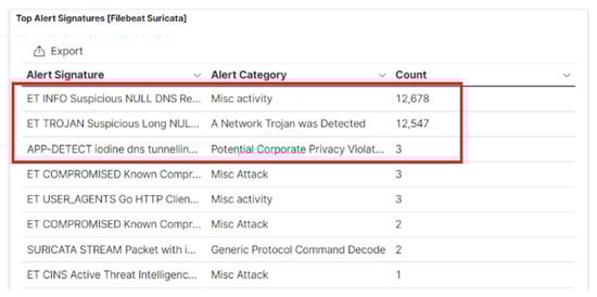 Another important feature of DNS data is time-to-live (TTL), which describes how long a DNS response for a domain should be cached and can be used for detection of DNS tunnelling. The recursive resolvers usually cache the information so instead of retrieving them again from the authoritative server, can simply reply with the cached record. The duration that the DNS record is required to be kept in the cache of a DNS server is referred to as TTL, which for a normal DNS record is mostly greater than 300 s. Hence, DNS data with a TTL value close to zero may indicate DNS tunnelling activity as a malicious user can use this approach to avoid DNS detection and blacklisting. Figure 12 shows that the DNS signature has content matches all highlighted in red, where the hex value 0x0001 indicates a null record and the TTL value of zero indicates no time for the intermediate cache, which points to the existence of DNS tunnelling [24,32].