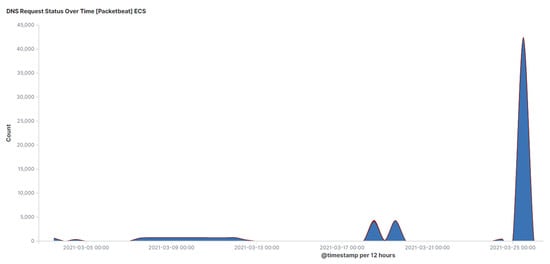 An effective strategy for traffic analysis is based on the fact that limited data can be exfiltrated in a DNS tunnel. Therefore, an increase in volume of DNS traffic over time may indicate malicious DNS activity. This strategy will be effective for networks with expectations of a lower number of DNS queries. Figure 14 shows high DNS traffic that was captured from the cloud environment experiments. However, in networks with a high volume of DNS traffic, this method will most likely give false positive results. Therefore, in the case of networks where the number of DNS queries is expected to be low, a high volume of DNS traffic may indicate DNS tunnelling activity.