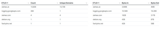 Another detection strategy is based on a given domain (suspicious domain) with multiple subdomains [12], where a suspicious domain with multiple subdomains can be a strong indicator of DNS tunnelling. In this study the ss or sl and ns subdomains are short, and a large amount of data was ingested in each of the subdomains. During the exfiltration, the client–server communication was hidden in the domain or subdomain names and, as result, a large number of new unique subdomains were generated. Figure 15 shows a significant number of subdomains for slehee.com and slehee.uk. In addition, the right-hand side table in Figure 15 shows a large number of bytes that are generated from DNS queries and responses (bytes in and out). This demonstrates the presence of malicious activities.