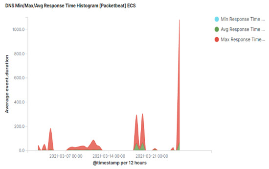 Another interesting observation for exfiltrated traffic via DNS is a higher time interval between consecutive pairs of queries and responses. This can be seen from Figure 16 where the average response time during exfiltration is approximately 70 ms (shown using green colour). The average response time for normal DNS traffic is approximately 20 ms [32]. Therefore, a higher than normal average response time is a strong indication of DNS tunnelling activities.