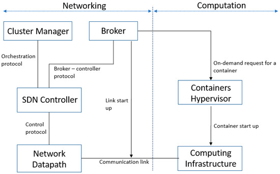 Considering the just-presented design, we also integrated the broker functionality into network functions inside the SDN controller, reducing the system complexity and eliminating the extra communication delay between the broker and controller. Additionally, a new top-level entity with the role of orchestrator among redundant SDN controllers was included in the system. These multiple orchestrated controllers can efficiently handle high control workloads and provide a more robust control plane against any potential failures or system threats [33,34]. The functions running in SDN controllers can automatically manage both networking and computational resources, resulting in a more efficient system operation.
