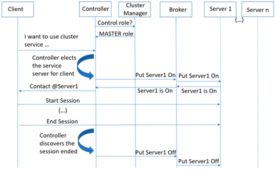 The top-level manager depicted in Figure 2 orchestrates all the available controllers, assigning each controller the correct control OpenFlow role. In the figure, the cluster manager assigns the MASTER role to the only available controller [34]. We also consider a group of data servers (i.e., Server 1 to Server n) organized into an edge server cluster, which offers the same service to potential clients. Each edge server is initially idle, with its network interface switched off, in an attempt to preserve service resources, e.g., to diminish the energy consumption. When a client requests an edge service, the controller elects an edge server to attend to that client request. Before reporting back the appropriate server to the client, the controller activates the elected server, including its network interface. At this step, the controller uses the algebraic representation (NetworkX) of the discovered network topology to obtain a list of potential future end-to-end network routing paths (not shown in Figure 2). These paths can be immediately configured at the network nodes by the controller, prior to the normal activation of data flows. This controller behavior can help protect the traffic quality of long-time data flows. Returning to Figure 2, during the client/server session, there is the expected bidirectional exchange of data service messages. Finally, when the controller is notified of the end of the service session, it switches off the edge server.