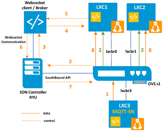 The proactive Ryu application installs into the switch not only the “ask to the controller” rule but also rules that define the correct output port to forward the flow to a pre-defined Linux container. This proactive behavior reduces the number of PacketIn/PacketOut messages between the OVS and the controller, especially for elephant flows. Alternatively, the reactive mode may be better than the proactive mode for controlling sporadic and short-duration IoT data flows. In this way, the reactive mode reduces memory usage on switches with significant limitations in computational resources. The next subsection provides some information on how the Ryu controller and the broker communicate.