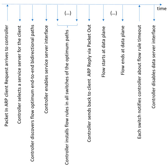 The following text details how the novel controller functionality responsible for supporting the automatic deactivation of each edge cluster data server was implemented. Additionally, when the edge server goes into the sleeping state, the current network function is also responsible for activating that server when it is needed again. Figure 5 visualizes the timeline of system actions that we discuss below. The first message sent by the client device to the network is an ARP request to discover the MAC address of the data server to fulfill the client service request. This ARP request arrives at the ingress switch, and the switch sends a copy of it to the SDN controller, using a PacketIn OpenFlow message (see the leftmost action in Figure 5 and Algorithm 1 below). The controller, inside the function associated with the PacketIn Event, parses the ARP header and learns the Virtual_IP address of the cluster edge server previously indicated by the client. At this stage, the controller assumes the role of a Proxy-ARP and invokes the internal function designated as generate_arp_reply() (step 4 of Algorithm 1). When this function is invoked, it receives two arguments: the client IP and the client MAC. Then, the generate_arp_reply() function calls other function, boot_analysis(), passing two arguments: Virtual_IP and the client IP (step 18). This function selects a dedicated server for that specific client (step 23) and boots up the network interface of that server (step 24) before returning to the calling function (step 25). Next, generate_arp_reply prepares the ARP reply message (step 19), considering the returned IP of the elected server, and returns it to the function that is processing the PacketIn Event together with the MAC_server (step 20). At this step, our solution tries to optimize network operation. Thus, the controller holds the ARP reply (step 4) and checks if it is necessary to install a proactive flow rule (step 5). If proactive flow rule installation is necessary, the controller uses the algebraic representation of the network (NetworkX) to discover the end-to-end path with the minimum cost between the current ingress switch (of the ARP Request) and the elected server (step 6), which may include several switches. After this, for each switch in the discovered path (step 7), the controller executes the next proactive tasks: (i) it finds the ingress port and egress port in the minimum cost path (step 8) and (ii) it creates and sends the flow rules for the switch (step 9). These flow rules support both IP and ARP unicast bidirectional traffic, which are expected to traverse the path. In this implementation, we should be aware that in the case of elephant flows, the ARP protocol can send several verification ARP requests to prevent any potential ARP table-poisoning attacks. Therefore, after initially installing the flow rules in the path switches, the controller needs to keep track of that event, e.g., by using a Boolean variable (step 11), which is set to False. This variable will be set to True again after the flow rules become idle and are deleted from the switches, and the associated server will have its network interface switched off (see step 18 of Algorithm 2 below). The main advantage of using this Boolean variable is that it helps the controller handle ARP requests that follow the first one. In this scenario, the controller only confirms the MAC address of the elected server without installing new flow rules. Otherwise, repeatedly installing flow rules in the switches during a running session could negatively impact service quality. It is important to note that end-to-end paths for distinct sessions may be completely different, enabling load balancing. When the initial flows are fully installed at the switches, the controller can finally send the ARP reply to the client with the MAC address of the elected server (step 13).