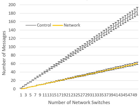 The average trend of these two reductions in the number of messages per each new data flow is visualized in Figure 6. We simulated each topology size (depending on N) ten times. In each evaluation round, there was a random uniform probability of a new data flow being admitted to the network. Overall, the reduction in system messages is more significant for larger networks, especially for the control channel. Below, we discuss the behavior of our proactive controller after an IoT data flow has terminated.