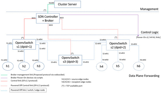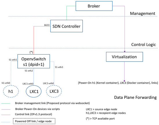 In our proposal, the system’s data plane is formed by switches, which communicate with a controller through the southbound API. There is also a top-level broker system entity that communicates with the controller via the northbound API. In the beginning, not all containers in data plane are running, enhancing the system’s sustainability in a similar way to what was previously proposed for data center networks [29]. Then, the broker, after detecting an increase in IoT data traffic, can automatically boot additional containers to process that data.