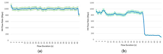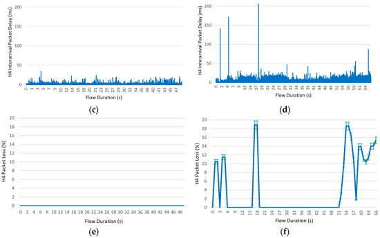 Average results of flow rate, flow interarrival packet delay, and flow loss percentage for the two compared controllers, during a 50 s service session between client h1 and data server h4. The proactive controller results are shown on the left side, and the reactive controller results are shown on the right. (a) Flow rate (Kb/s) for the proactive controller, (b) flow rate (Kb/s) for the reactive controller, (c) flow interarrival delay (ms) for the proactive controller, (d) flow interarrival delay (ms) for the reactive controller, (e) flow loss percentage for the proactive controller, (f) flow loss percentage for the reactive controller. In (a,b,f), the variation bars around non-null average results are visualized in green.