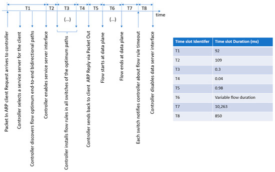 Considering the proactive flow controller, we measured the system time slots shown in Figure 5 in Section 3.2.3. The measured time slots (ms) are shown in Figure 10. By far, the highest time slot is T7, which is 10.3 s. This is because the idle timer of the used OpenFlow flow rules was configured for 10 s.