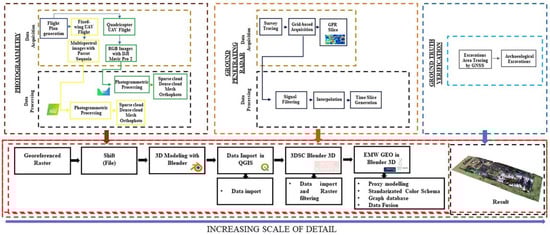 - Validation of a protocol for the combined use of sensors in archeological surveys to support 3D reconstruction at the territorial scale. This protocol is formulated according to the logic that a lower intensity corresponds to a greater extent of investigation and vice versa [26,27]. This means that intensity is a combination of acquisition and processing time, implementation cost, lower impact on remains, and greater effectiveness of NDT compared to archeological excavation alone [28,29].