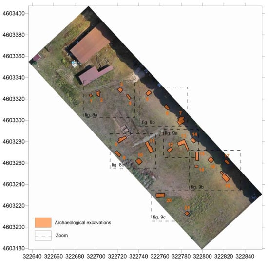 - Calleja, J.F.; Requejo Pagés, O.; Díaz-Álvarez, N.; Peón, J.; Gutiérrez, N.; Martín-Hernández, E.; Cebada Relea, A.; Rubio Melendi, D.; Fernández Álvarez, P. Detection of Buried Archaeological Remains with the Combined Use of Satellite Multispectral Data and UAV Data. Int. J. Appl. Earth Obs. Geoinf. 2018, 73, 555–573. [Google Scholar] [CrossRef]