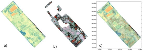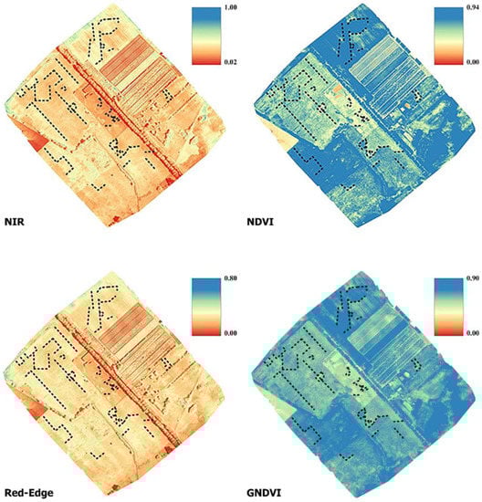 - NIR: Near infrared is one of the most productive spectra for cropmark detection [65,66]. More specifically, green and healthy plants tend to show high values in the NIR band, while stressed vegetation is characterized by a low NIR value due to water or nutrient deficiency. This fact makes the NIR band ideal for identifying archeological cropmarks related to changes in the growth and/or color of vegetation compared to the surrounding environment. In the NIR band (700/750 nm to 1400 nm), the spectral characteristics of leaves are no longer determined by pigments. The very steep increase in energy reflectance between 700 nm and 750 nm is located exactly in the “red edge” zone, i.e., the most important feature in the reflectance spectrum of healthy vegetation. This transition zone with a very abrupt change in reflectance results from the fact that absorption by pigments is low and NIR reflectance increases, leading to one of the most extreme slopes in the reflectance spectra of natural materials. It should also be noted that the red-edge band is a sensitive spectral band that helps to improve the accuracy of plant classification and, thus, the identification of anomalies [67]. The following indices were calculated using the multispectral camera: