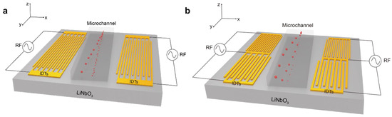 Diagram of the microfluidic particle sorting device with a pair of IDTs (a) and multiple pairs of IDTs (b).