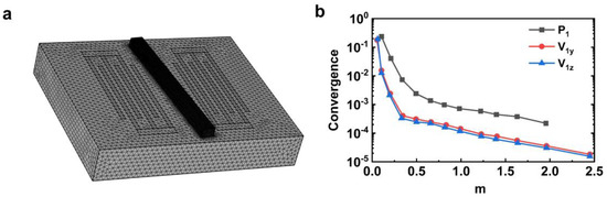 Different mesh sizes will result in different simulation results and simulation times, thus reliable mesh method is necessary. In all simulation models, the tetrahedral mesh grid was used. The mesh size is controlled by the parameter factor m. In all of the models, the maximum mesh size was limited to in the substrate region and in the fluid region, where is a predefined parameter. is the wavelength of the SAW, and is set for the calculation. Figure 3a shows the grid used throughout the model, which consists of 6.1 × 105 cells.