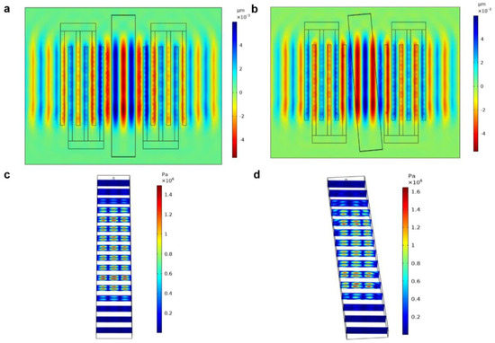 The displacement generated on the substrate surface when the channel was placed in parallel (a) and placed with an angle (b) to the IDT. The acoustic pressure distribution in the channel when the channel was placed in parallel (c) and placed with an angle (d) to the IDT.