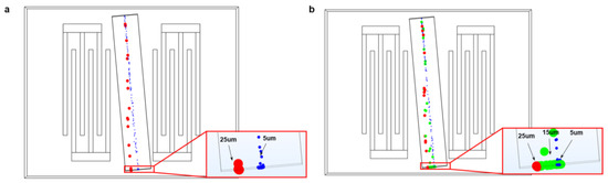 Particles with diameters of 5 μm, 15 μm, and 25 μm are released at the inlet of the channel, which is located at the center of the inlet. The particle trajectories, under the coupling effect of the acoustic and flow fields, are shown in Figure 5. Since ARF is proportional to a3 (a is the particle diameter), the 15 μm and 25 μm particles are subject to a strong ARF. The 25 μm and 15 μm particles traverse multiple pressure nodes and antinodes due to a relatively large ARF. The 5 μm particles receive insufficient acoustic radiation and therefore move along the flow direction. The separation trajectory results of the 5 μm and 25 μm particles are shown in Figure 5a. It can be seen, in the outlet, that the separation between the 5 μm and 25 μm particles is effective. However, when three different diameter particles flow into the channel, such as 5 μm, 15 μm, and 25 μm, it is difficult to separate them totally. From Figure 5b, the 15 μm particles were mixed with the 5 μm and 25 μm particles. Thus, the device system should be optimized to separate multi-size particles.
