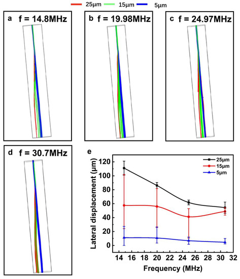 Flow trajectories of particles with different resonant frequencies (a–d) (14.8 MHz, 19.98 MHz, 24.975 MHz, 30.7 MHz); the lateral displacement summary of the particles under various driving frequencies (e).