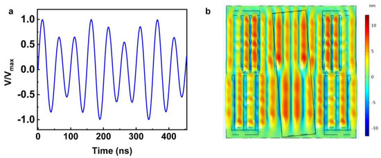 The surface acoustic waves generated by the IDT must be continuous to allow the classification of particles of various sizes without losing the resolution. The integrated driving signal was shown in Figure 9a, the signals with two different frequencies were coupled together, and the amplitude of the two signals could be changed depending on the application. Through time-domain simulation studies, we can observe that continuous SSAWs are generated on the surface of the device. From Figure 9b, we can see the surface displacement generated by two electrodes with different wavelengths. In addition, the SSAW profile was related to the SAW wavelength. Therefore, the programable acoustic pressure could be generated by changing the wavelength of the IDT as well as the amplitude of the driving signal. We believe this technique can be applied in real applications for highly efficient separation of particle mixtures.