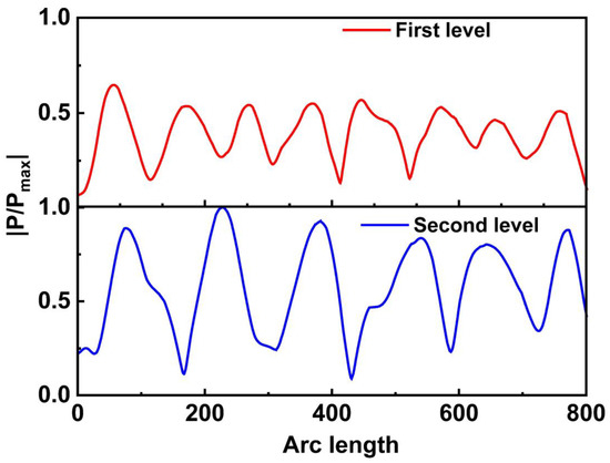 In theory, if different input voltages of the two frequencies were applied, the vibration amplitude and the acoustic pressure of the SAW would be different. Therefore, it is possible to determine the distribution of various acoustic pressure amplitudes by modifying the input amplitude. For the designed multi-stage sorting device, the normalized acoustic pressure is shown in Figure 10. The periods of the two-stage acoustic pressure correspond to the wavelength of the IDT, and the acoustic pressure amplitude is related to the driving signal’s amplitude.