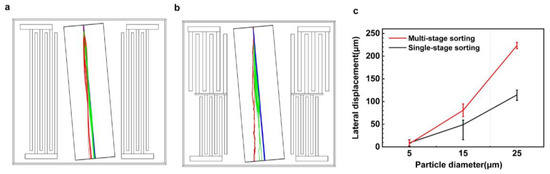 Figure 11c describes the particle separation distances of single-stage sorting and multi-stage sorting for three different particle sizes. It can be seen that the multi-stage sorting design was superior to single-stage sorting in terms of lateral displacement, and the particle trajectories do not overlap. The sorting efficiency of the multi-stage sorting for three different sizes of particles is noted as 99%, much higher than the 70% efficiency of single-stage sorting.