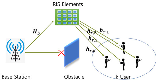 The future wireless communication system has a high demand for a high data rate, high spectral efficiency, and uninterrupted service to the end user [1]. Fifth-generation (5G) and sixth-generation (6G) mobile communication provide a multi-gigabit communication system for the users [2]. However, the present technologies are struggling to provide high-speed data connections, and breakthrough technologies are being investigated to provide adequate support. Specifically, new solutions of new spectrum and low-energy consumable techniques along with a minimum hardware cost are desirable. Many new concepts and technologies are now being researched for solving wireless communication-related problems. Recently, a new paradigm for wireless communication was introduced as a reconfigurable intelligent surface (RIS) [3,4,5,6]. A RIS is a planar array of a large number of passive elements, where each element can change the phase shift of the incident signal independently [7]. Each element is a low-cost inexpensive surface of an electromagnetic material which can be controlled by a smart controller. This gives a unique opportunity not only to reflect but also to modify the shape of the reflected signal. Currently, RIS implementations include a conventional reflection array, software-defined meta-surfaces, and liquid crystals [8]. Figure 1 shows a typical application scenario for a RIS-based communication system. The original signal is blocked due to some obstacles and an alternative path is being created via RIS elements. The base station can serve the user in spite of the signal being blocked by obstacles. Usually, the RIS elements are mounted on a wall to reflect the signal to the user location.