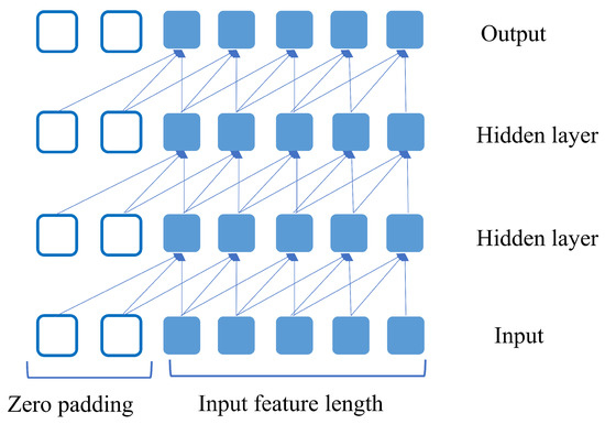 TCN workflow with the sequential data in each layer is shown in Figure 2. One of the characteristics of TCN is that it has an equal number of inputs and output sequences in each layer. This is ensured by adding zero padding to each layer shown in the white box of Figure 2. TCN uses casual convolution to stop the leakage of any information from the future to the past. This design can have a very long history size and can handle a network for which large size kernels are needed. To tackle this problem, dilation is introduced in TCN. For a 1-D sequence input with a filter , the dilated convolution operation for sequence t is written as follows: