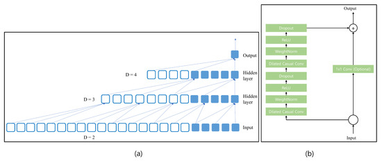 In the case of TCN as shown in Figure 3b, the residual block consists of dilated causal convolution block, weight normalization block, rectified linear unit (ReLU), and dropout block. The same configuration is repeated two times, and after that, the input is added to the resulting value.