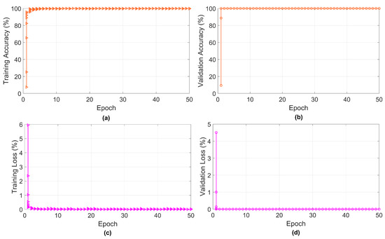 Training progress of proposed TCN model: (a) training accuracy with 50 epochs, (b) validation accuracy with 50 epochs, (c) validation accuracy with 50 epochs, and (d) validation loss with 50 epochs.